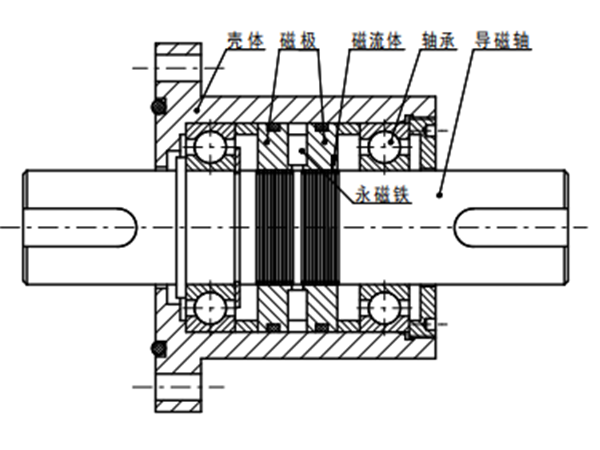 磁流體密封裝置的功能是把旋轉(zhuǎn)運(yùn)動(dòng)傳遞到密封容器內(nèi),常用于真空密封,其基本原理見(jiàn)下圖: